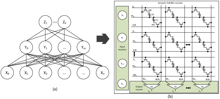 Abstract: Artificial intelligence AI has become ubiquitous in modern computing systems, from high performance data centers to resource constrained edge devices. As AI applications continue to expand into mobile and IoT domains, the need for energy efficient neural network implementations has become increasingly critical. To address this challenge, this work presents a binary weighted neural network BWNN architecture implemented using FeRAM ferroelectric RAM based synaptic arrays. By leveraging the non volatile nature and low power operation of FeRAM based computing in memory CIM, the proposed architecture achieves significant reductions in both dynamic and standby power consumption. Simulation results demonstrate that scaling the ferroelectric capacitor size reduces dynamic power by up to 6.5 percent, while eliminating DRAM like refresh cycles decreases standby power by more than 258 times under typical conditions. Furthermore, the combination of binary weight quantization and in memory computing enables energy efficient inference without significant loss in recognition accuracy, as validated using MNIST datasets. Compared to SRAM CIM, DRAM CIM, and STT MRAM CIM architectures, the proposed FeRAM CIM achieves superior energy efficiency, reaching 230 to 580 TOPS per watt in a 45 nm process. These results highlight the strong potential of FeRAM based BWNNs for energy constrained edge AI and IoT applications.