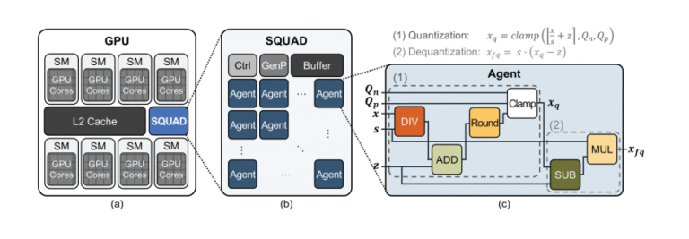 Abstract: Quantization aware training QAT is a key technique for maintaining neural network accuracy at extremely low bit precision such as 4 bit or lower. However, fake quantization operations introduce significant training time overhead compared to post training quantization. To address this challenge, this work proposes SQUAD, a scalable hardware accelerator designed to perform fake quantization operations with high performance and energy efficiency across multiple precision levels. The SQUAD architecture consists of multiple parallel and pipelined quantization accelerator cores with dedicated buffers and control units. Evaluation using ResNet, MobileNetV2, and DeiT models demonstrates that SQUAD reduces fake quantization latency by 93.1 percent and energy consumption by 97.6 percent compared to a commercial edge GPU. When integrated into edge GPU training workflows, SQUAD reduces forward pass latency by 48.8 percent and energy consumption by 51.2 percent. Overall, this results in a total training latency reduction of 14.6 percent and energy reduction of 15.3 percent, with only 0.43 percent hardware area overhead, highlighting its strong potential for energy efficient on device AI training.