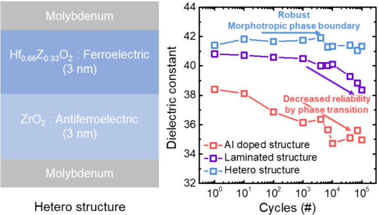 Abstract: This study investigates structural engineering strategies to suppress wake up effects in HfxZr1−xO2 HZO based metal ferroelectric metal capacitors exhibiting morphotropic phase boundary characteristics. Three configurations were analyzed, including Al doped, nanolaminated, and heterostructured HZO films. Depth profile X ray photoelectron spectroscopy and atomic force microscopy analyses revealed distinct differences in oxygen vacancy concentrations and grain sizes, which directly correlate with wake up behavior. The heterostructured HZO exhibited the lowest oxygen vacancy concentration at 2.49 percent and the largest average grain size of 7.5 nm, compared to Al doped HZO and laminated HZO. Due to its optimized defect distribution and improved grain morphology, the heterostructured HZO maintained stable phase composition even after 10^4 cycles, with minimal degradation in crystallinity and dielectric properties. These results highlight its strong potential for reliable and stable ferroelectric memory applications, particularly for high capacitance dynamic random access memory and neuromorphic computing systems.